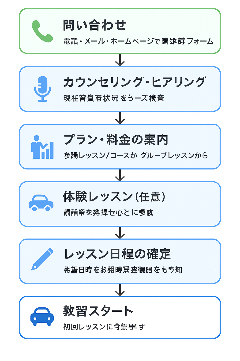 運転に自信がない方でも、マンツーマンなら着実にスキルアップできます。まずはお気軽にお問い合わせくださいませ。